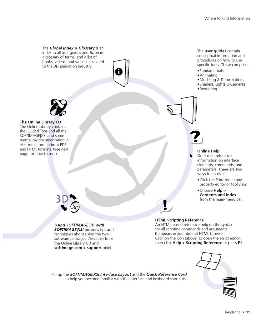 From the analog days of SOFTIMAGE|XSI 1.0, the Where to Find Information page from the printed manual…