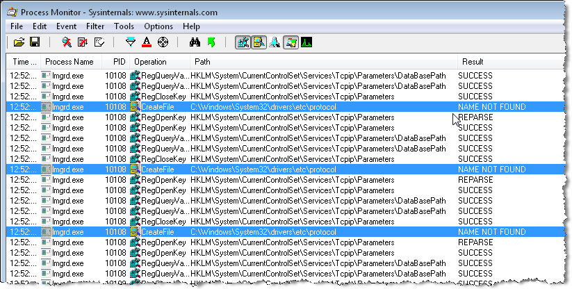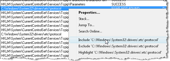 To check whether LMTOOLS eventually did find the protocol file, I right-clicked “C:\windows\system32\drivers\etc\protocol” and clicked Include, to include only the log entries for the protocol file.
