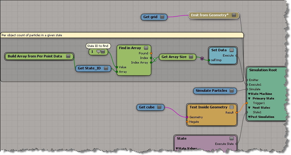 Here we get an array of the points that are in State 1, and then save the size of the array (eg the number of points in State 1) as a per-object value.