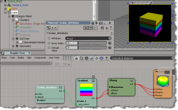 Using mesh ICE attributes to drive shaders in a render tree Posted on April 21, 2011 by xsisupport In Softimage 2012, you can now use attributes from the ICE tree on a mesh to drive the render tree. For example, the ICE tree on a cube could calculate an attribute that drives the position of the colors on a gradient: Share this: Click to share on Facebook (Opens in new window) Facebook Click to share on X (Opens in new window) X Like Loading... Related