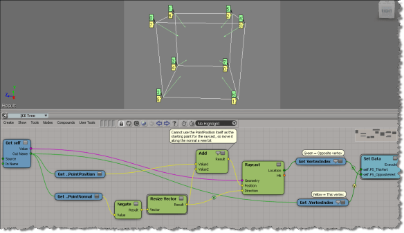 - For the start position of the raycast, don’t use the PointPosition (because you’ll just get the same point back as the raycast hit). Instead, move along the normal a bit and use that as the starting point for the raycast.