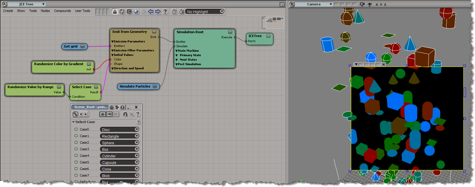 The primitive shapes (Point, Segment, Disc, Rectangle, and so on) are controlled by the Shape parameter, which is an integer parameter with 10 possible values. So you could just plug a Random Value node into the Shape port, set the mean to Box, and the variance to 4 or 5. Note that if the random value goes out of range, you get a point.