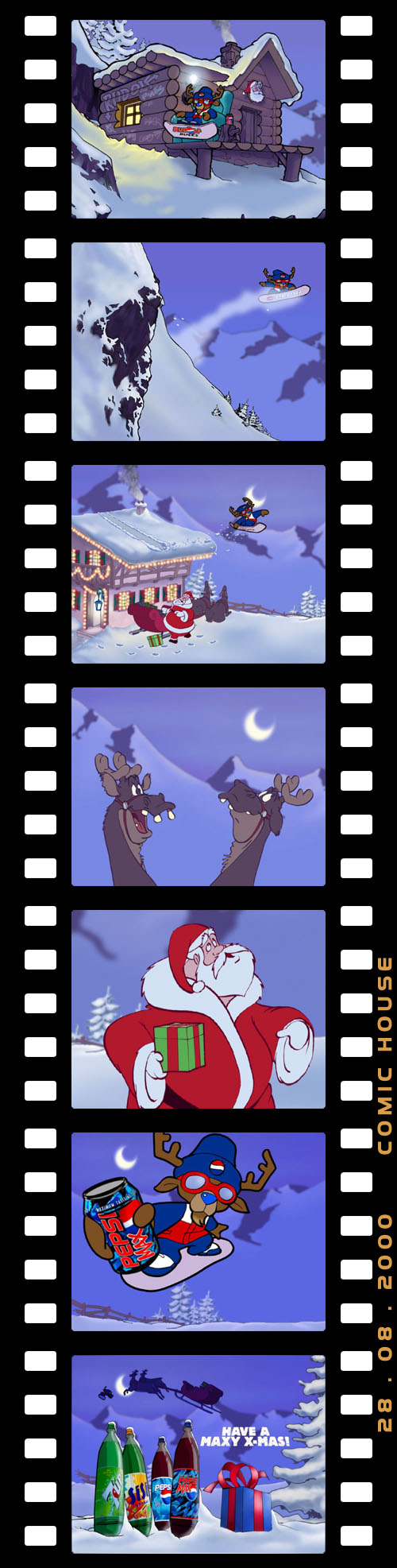 “As with most of our projects, all the animation on ‘Rudolph’ was first done by hand, then processed by cleanup and ink artists,” Buying explains. “The inked artwork was then scanned into Toonz and painted using the Ink and Paint module. All the Pepsi cans were created using SOFTIMAGE|3D. We used the rotoscope to load all the pencil tests into perspective view then, using the pencil animation frames as a reference, we positioned, rotated and scaled each can frame-by-frame. We rendered the cans and the packshot with the SOFTIMAGE cartoon renderer, matching the cartoon style as close as we could.”
