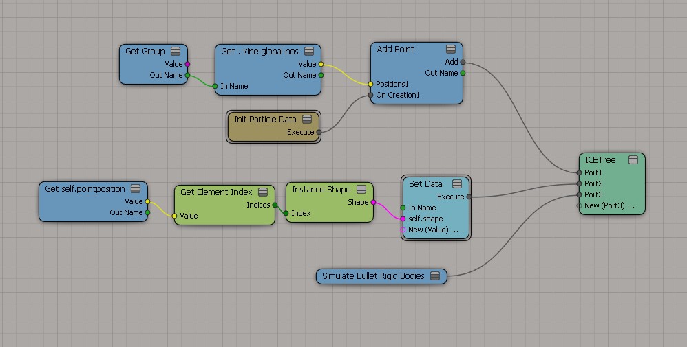 Nodes/attributes: Add Point, Init Particle Data, Get Element Index, Instance Shape, Simulate Bullet Rigid Bodies