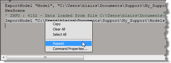 Tip: Repeating logged commands in the script history Posted on November 5, 2011 by xsisupport Reply Here’s a quick way to repeat the scripting commands logged for something you just did in Softimage: In the script history log, highlight the lines you want to repeat. Right-click and click Repeat.