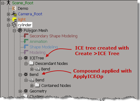 If you create the ICE tree yourself and hook up the compound, you don’t get this behavior. That’s because ApplyICEOp knows what compound is being applied, so it can nest the compound node directly under the ICE operator node, and the operator PPG can inspect the compound parameters.