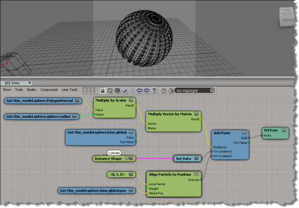 Here’s the ICE tree (which is on a point cloud of course 😉 The use of PolygonNormals and the sphere radius is neat.