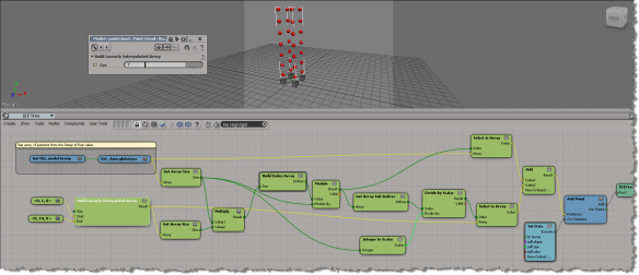 Here’s a simple example. I get the positions of the objects in a group, and then use those positions to add points in a point cloud. Basically, I have a group of objects, and an array of vectors (the interpolated array). When I add a point, I take an object position and add a vector to it to get the point position.