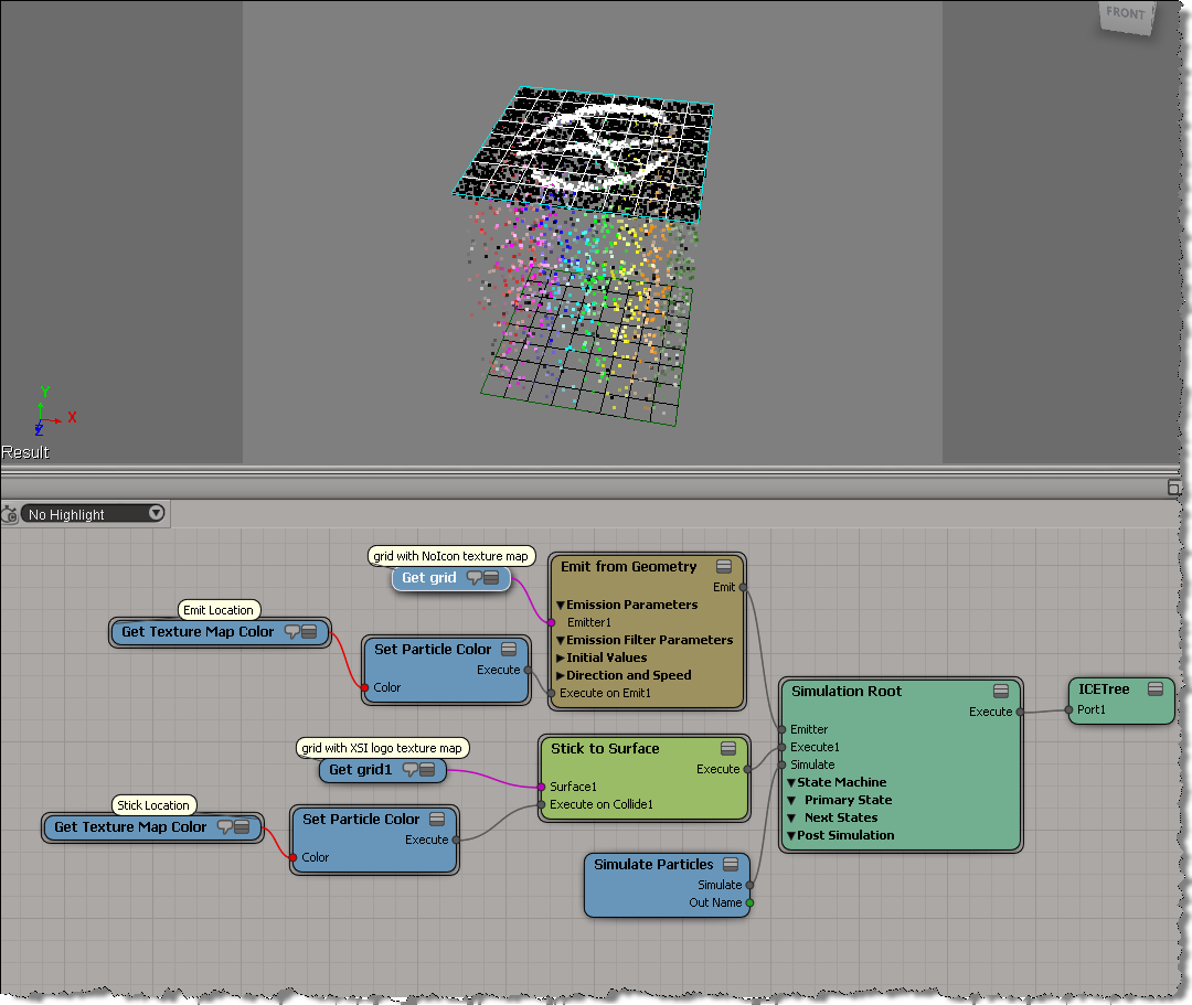 In this example, the emitter grid has NoIcon.pic as a texture map, and the second “stick-to” grid has the XSI logo.