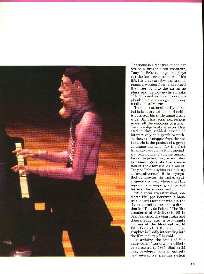 John Lasseter, one of the festival’s judges and future director of Toy Story, Toy Story 2, and A Bug’s Life, declared: “Years from now Tony de Peltrie will be looked upon as the landmark piece, where real, fleshy characters were first animated by computer.” (Maclean’s, September 9 th, 1985)