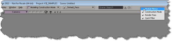 That’s because the module menus were hidden. To show the module menus, right click and empty area on the Softimage menu bar, and click Module Menus.\