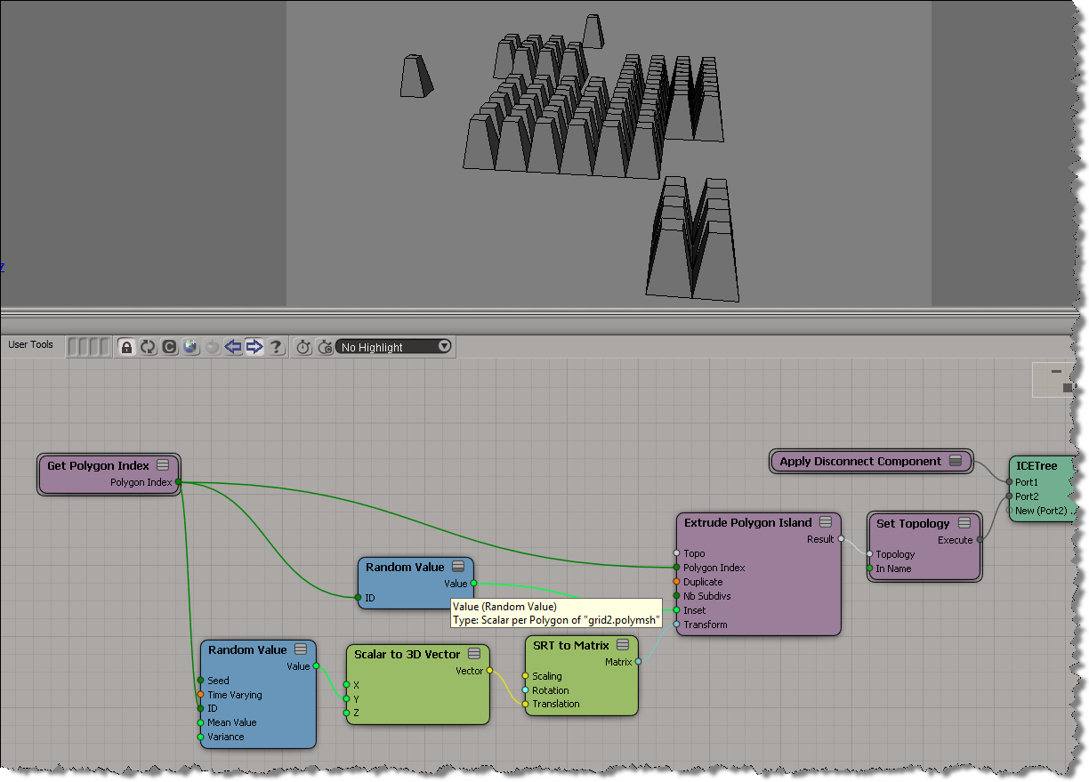 I didn’t look yet at the Random Extrusion compound Guillaume posted yesterday, because I wanted to work through the basics on my own (but do go get his compound, it’s sure to be pretty useful). Here’s a simple ICE tree that uses a different random length for each extruded polygon: