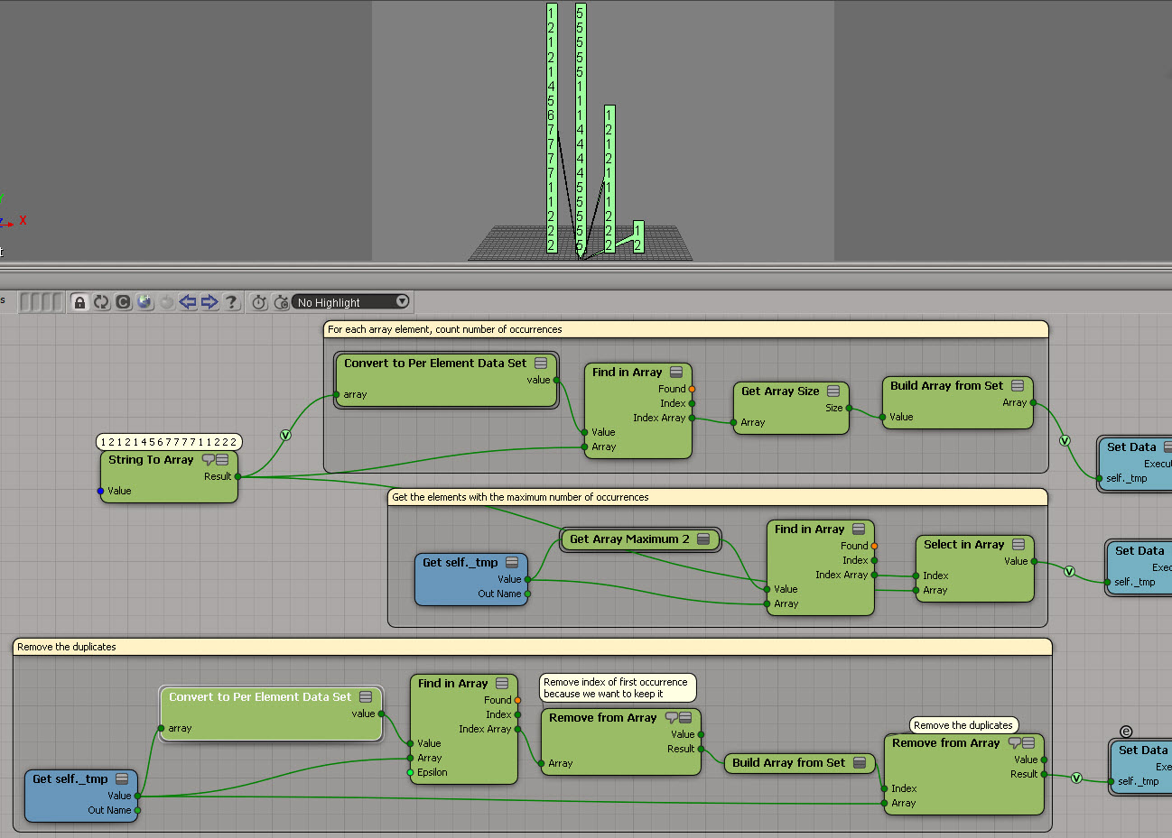 Another example usage of Generate Sample Set instead of Repeat. This time, the problem is to find the array element with the most occurrences. This seems kinda long winded (it’s a three-step process), but it does handle the case where you have two or more elements that occur the same number of times.