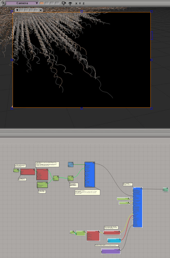 Here’s an overview of the SOFTIMAGE|PARTICLE interface (from the Particle User Guide) and a few screenshots of the viewport.