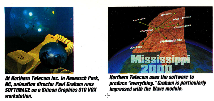 At Northern Telecom lnc. in Research Park, NC, animation director and marketing specialist Paul Graham uses SOFTIMAGE to produce “everything from brochure covers and videos to high-res images for trade show display panels,” says Graham. Running on a Silicon Graphics 310 VGX workstation, the SOFTIMAGE system at Northern Telecom includes the Nefertiti paint program and the Eddie compositing module, which provides in-computer integration of live action and special effects.