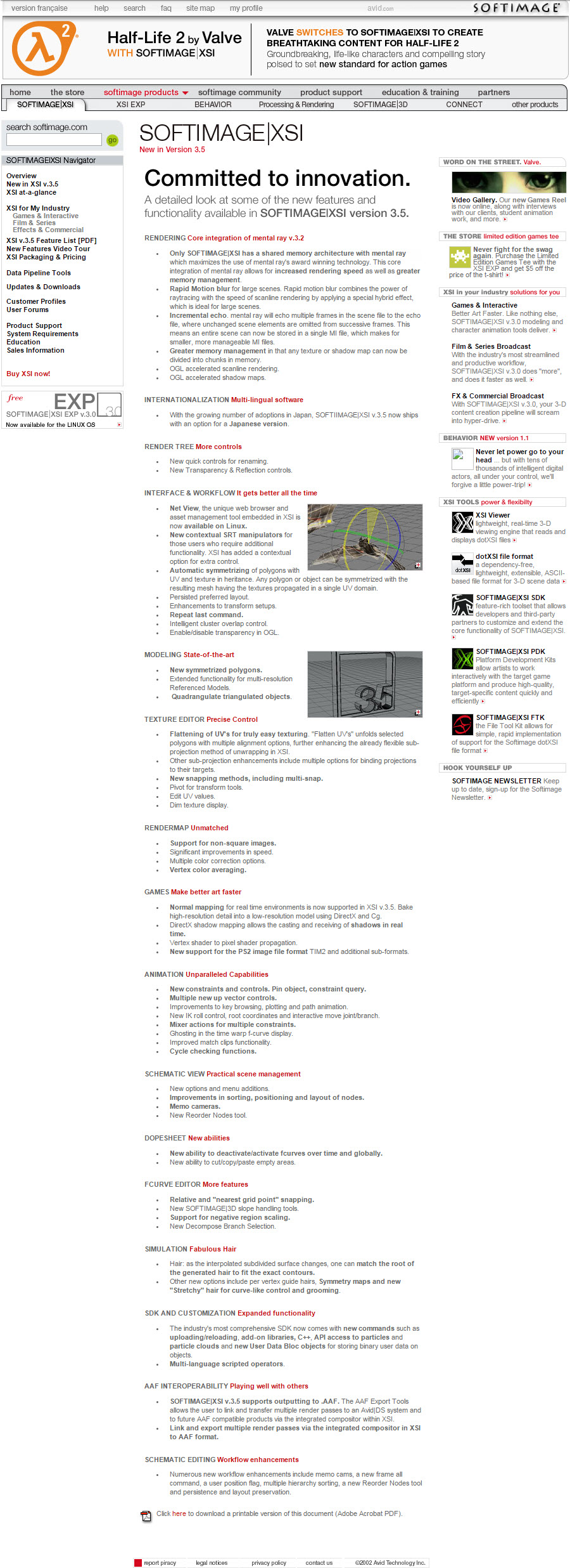 The latest version of the XSI environment, which follows less than six months after the release of version 3.0, is driven by the production requirements of industry leading customers, including Capcom, Electronic Arts, Industrial Light & Magic (ILM), Konami, Mainframe, Pixel Liberation Front (PLF), Sega, The Mill and Valve, and continues the company’s unmatched pace of development. The SOFTIMAGE|XSI v.3.5 environment further extends Softimage’s position as the professional 3-D market leader in innovation, customer responsiveness and return on investment.