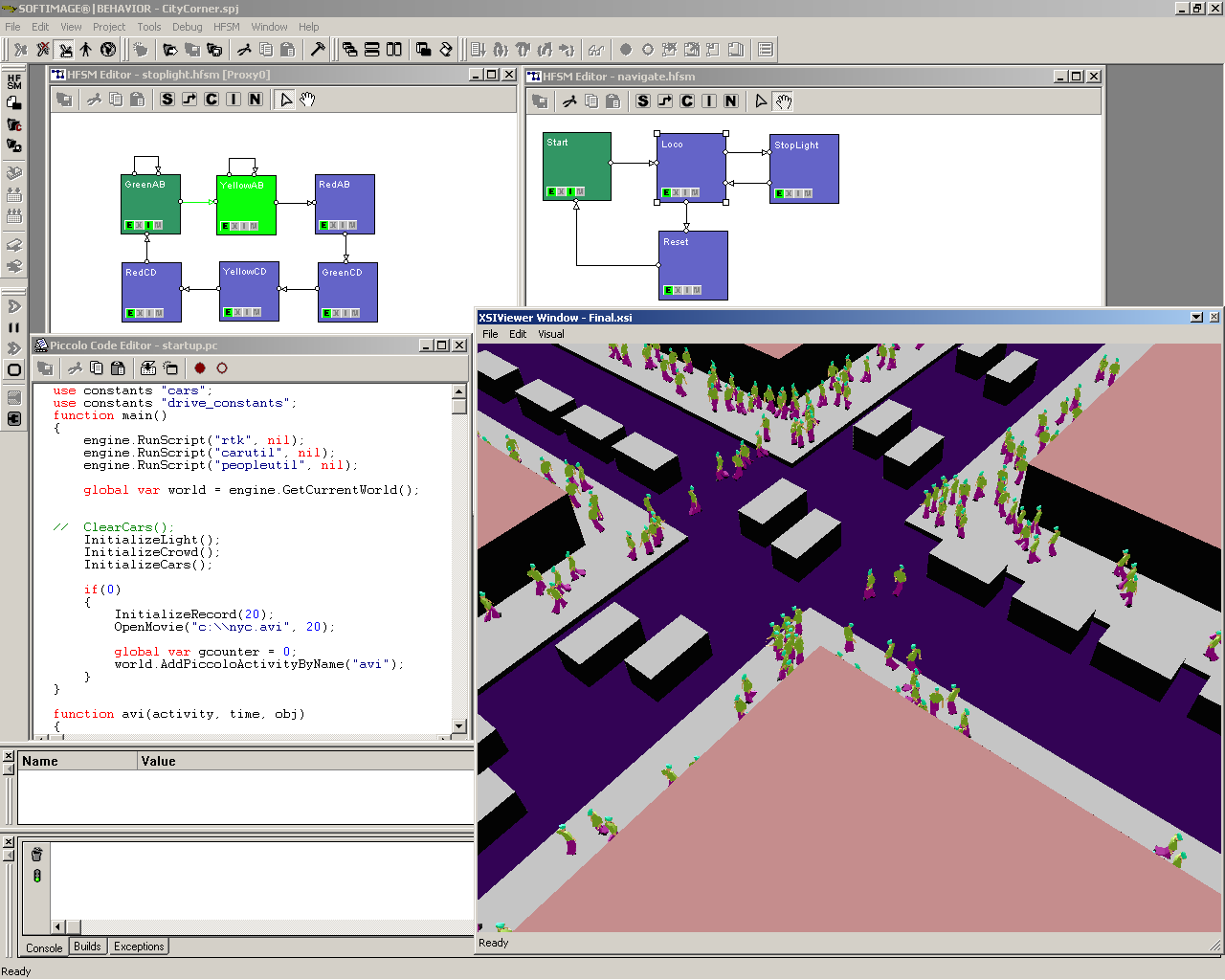 Friday Flashback #304 Posted on June 2, 2017 by xsisupport Reply SOFTIMAGE|BEHAVIOR screenshot: Hierarchical Finite State Machines (HFSM), Piccolo code, and the XSIViewer