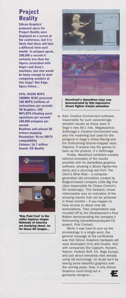 Friday Flashback #457 Posted on July 9, 2021 by xsisupport Silicon Graphics: showing offEDGE magazine April 1994 Sega’s latest AS-1 ride…was completely rendered using Softimage’s Creative Environment software If anyone has the games to back up the product, it’s Softimage. Share this: Click to share on Facebook (Opens in new window) Facebook Click to share on X (Opens in new window) X Like Loading... Related