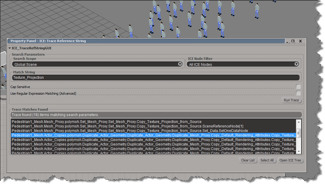 Specify search options, enter a Match String, then press the trace button. If matches are found, the address of the ICE Nodes are listed in the Match List at the bottom of the GUI. If items are selected in the Match List, their corresponding nodes are selected in the scene
