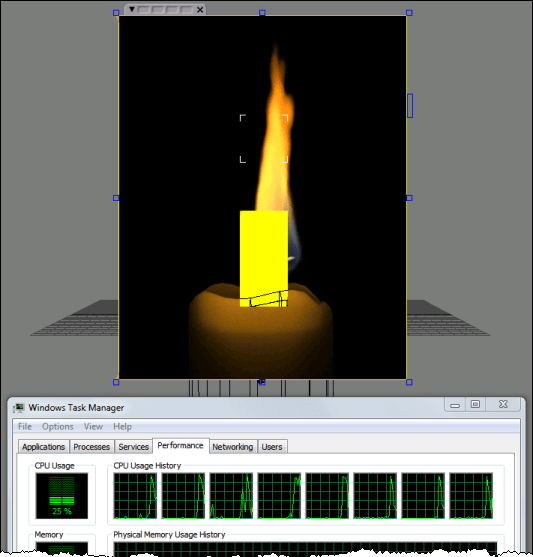 Here’s a screenshot of a render region of the ICE_Candle example scene. I didn’t have to do anything for Softimage to use all cores: