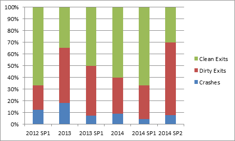 Crashes are actual crashes caught by CER. What I called “dirty exits” are exits or crashes not caught by CER. For example, killing xsi.exe in the Task Manager is a dirty exit. Clean exits are when you quit Softimage normally (for example, when you click File > Exit or the Close X icon).